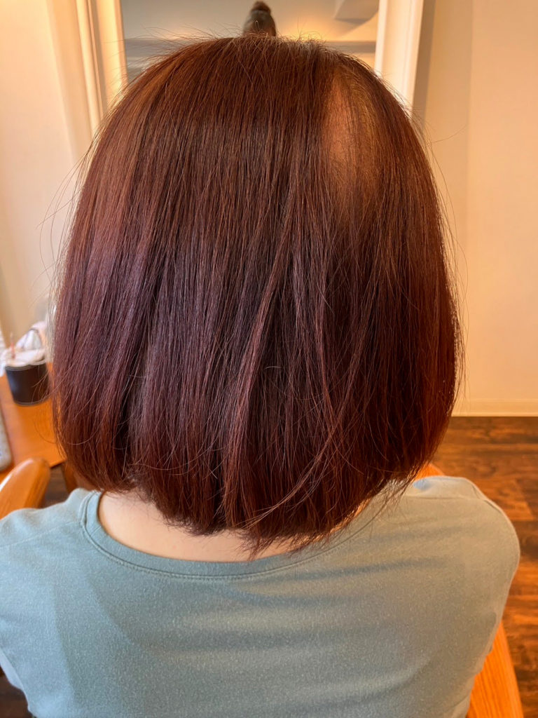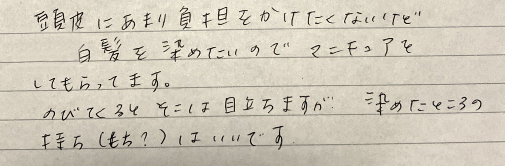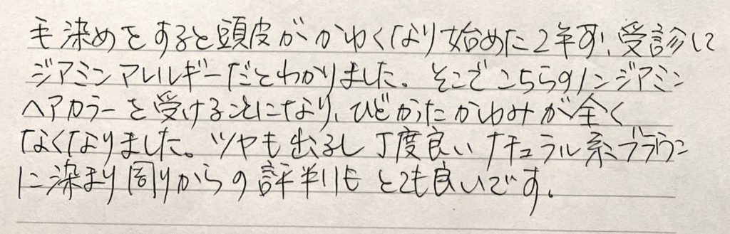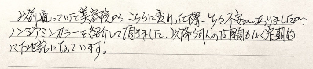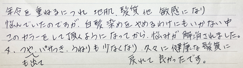 髪質改善の ビフォア・アフターと お客様の声をご紹介 髪と地肌に優しいエイジングケアカラーの ビフォア・アフターやお客様の声をご紹介 髪と地肌に優しい エイジングケアカラーの ビフォア・アフターや お客様の声をご紹介 掲載している施術例には、技術監修元が作成した仕上がり例を含みます。当サロンはセーフティーカラーリスト認定サロンとして、独自の判断と責任で施術を行っています。 ノンジアミンカラー施術1 ビフォア アフター ビフォア分け目 アフター分け目 「お客様のお声」 「お客様のお声」 「毛染めをすると頭皮がかゆくなり始めた2年前、受診してジアミンアレルギーだとわかりました。そこでこちらのノンジアミン ヘアカラーをうけることになり、ひどかったかゆみが全くなくなりました。ツヤもでるし丁度良いナチュラル系ブラウンに染まり周りからの評判もとても良いです。」(Cさま) ノンジアミンカラー施術2 ビフォア アフター ビフォア分け目 アフター分け目 「お客様のお声」 「お客様のお声」 「以前通っていた美容室からこちらに変わった際 少々不安がありましたがノンジアミン カラーを紹介して頂きました。以降 何の問題もなく定期的にお世話になっています。」 ノンジアミンカラー施術3 ビフォア アフター ビフォア分け目 アフター分け目 「お客様のお声」 「お客様のお声」 「年令を重ねるにつれ 地肌、髪質他 敏感になり悩んでいたのですが、白髪染をやめるわけにもいかない中 このカラーをして頂くようになってから、悩みが解消されました。又、つやも出て、パサつき、うねりも少なくなり、久々に健康な髪質に戻れてよかったです。」 LINE予約お問合せ方法へ ハーブカラー施術1 ビフォアー アフター ビフォアー分け目 アフター分け目 「お客様のお声」 「お客様のお声」 「ハーブカラーは肌にやさしいということで10年程継続してお世話になっています。自然な髪の艶もあり、頭皮にストレスもありません。いつもありがとうございます。」 ハーブカラー施術2 ビフォアー アフター ビフォアー分け目 アフター分け目 「お客様のお声」 「お客様のお声」 「色あいがよく、匂いやかゆみもなく、とても気に入り、それ以来ずっとお世話になっています。ハーブを利用しているせいか、髪の毛の傷みもなく、これからも続けていこうと思っています。おすすめです!」 ハーブカラー施術3 ビフォア アフター ビフォア(トップ) アフター(トップ) LINE予約お問合せ方法へ 「お客様のお声」 「お客様のお声」 「とてもしっとりして トリートメント効果があると思います。長く続けていきたいです。」 ヘアマニキュア施術1 ビフォア アフター ビフォア(トップ) アフター(トップ) 「お客様のお声」 「お客様のお声」 「頭皮にあまり負担をかけたくないけど白髪を染めたいのでヘアマニキュアをしてもらってます。のびてくるとそこは目立ちますがそめたところの持ち(もち)はいいです。」 ヘアマニキュア施術2 ビフォア アフター ビフォア(トップ) アフター(トップ) 「お客様のお声」 「お客様のお声」 「肌荒れを気にせずに染めることができることと、色の種類が豊富なので色々楽しめて良いと思います。」 ヘアマニキュア施術3 ビフォア アフター 「お客様のお声」 「お客様のお声」 「アレルギー体質のためマニキュアで染めています。頭皮のトラブルは全くなく、白髪も目立たなくなるので、安心してお任せできます。」 ヘアマニキュア施術4 ビフォア アフター ビフォア(トップ) アフター(トップ) 「お客様のお声」 「お客様のお声」 「肌が弱く、薬剤が頭皮に着くと痛かったり施術後ずっとかゆみが続いたりするくらい敏感肌です。こちらのヘアマニキュア は仕上がりも自然でつやもでてお手入れもしやすく、全く問題なく安心して白髪染めできます。」 ヘアマニキュア施術5 ビフォア アフター ビフォア(トップ) アフター(トップ) 「お客様のお声」 「お客様のお声」 「ゴワゴワ感など無く ツヤ感が出て手入れしやすくなった ちゅうちょしていたが 白髪が気にならなくなり やって良かった」 LINE予約お問合せ方法へ